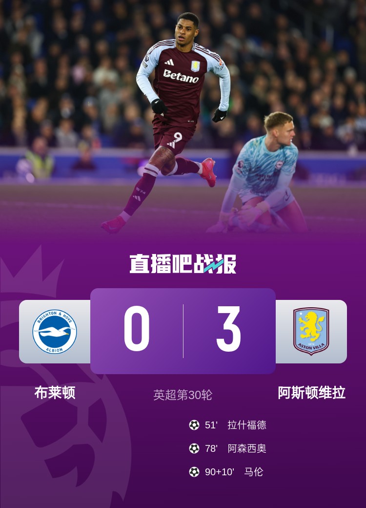 拉什福德、阿森西奧、馬倫破門(mén),維拉3-0布萊頓各賽事六連勝。