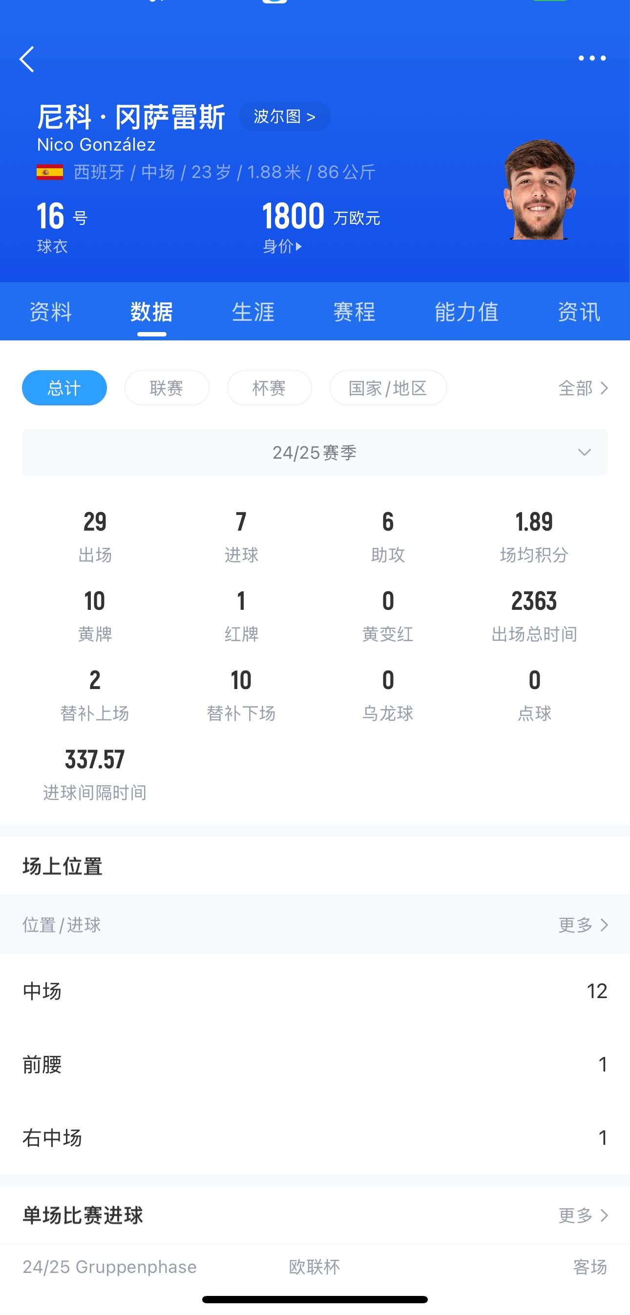 尼科-岡薩雷斯,現年23歲,西班牙中場(chǎng),出自拉瑪西亞青訓,2023年夏窗波爾圖花費840萬(wàn)歐簽下球員,本賽季尼科代表波爾圖出戰29場(chǎng)比賽,貢獻7球6助,目前球員德轉身價(jià)1800萬(wàn)歐。