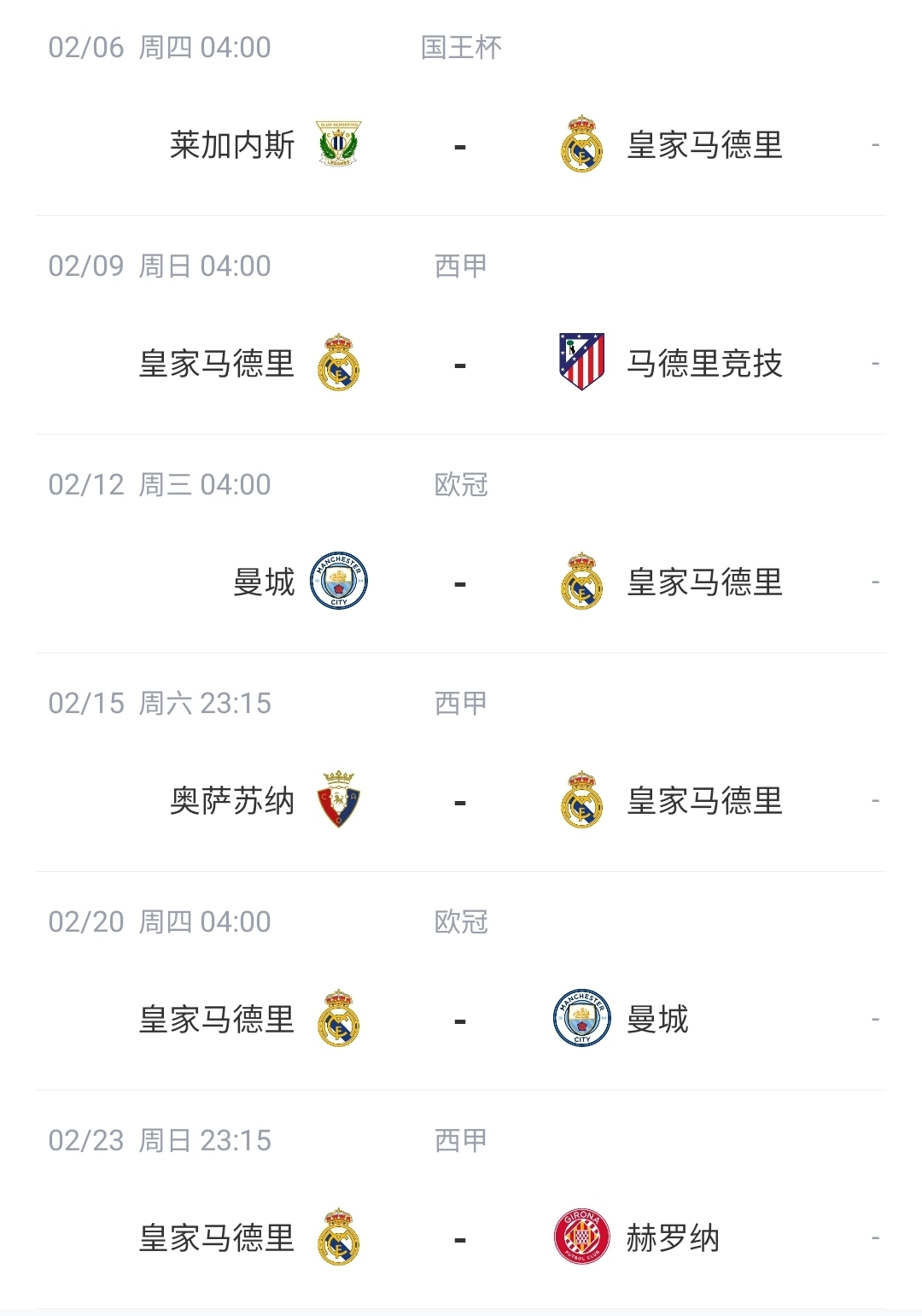 2月6日,皇馬將在國王杯1/4決賽對陣萊加內斯