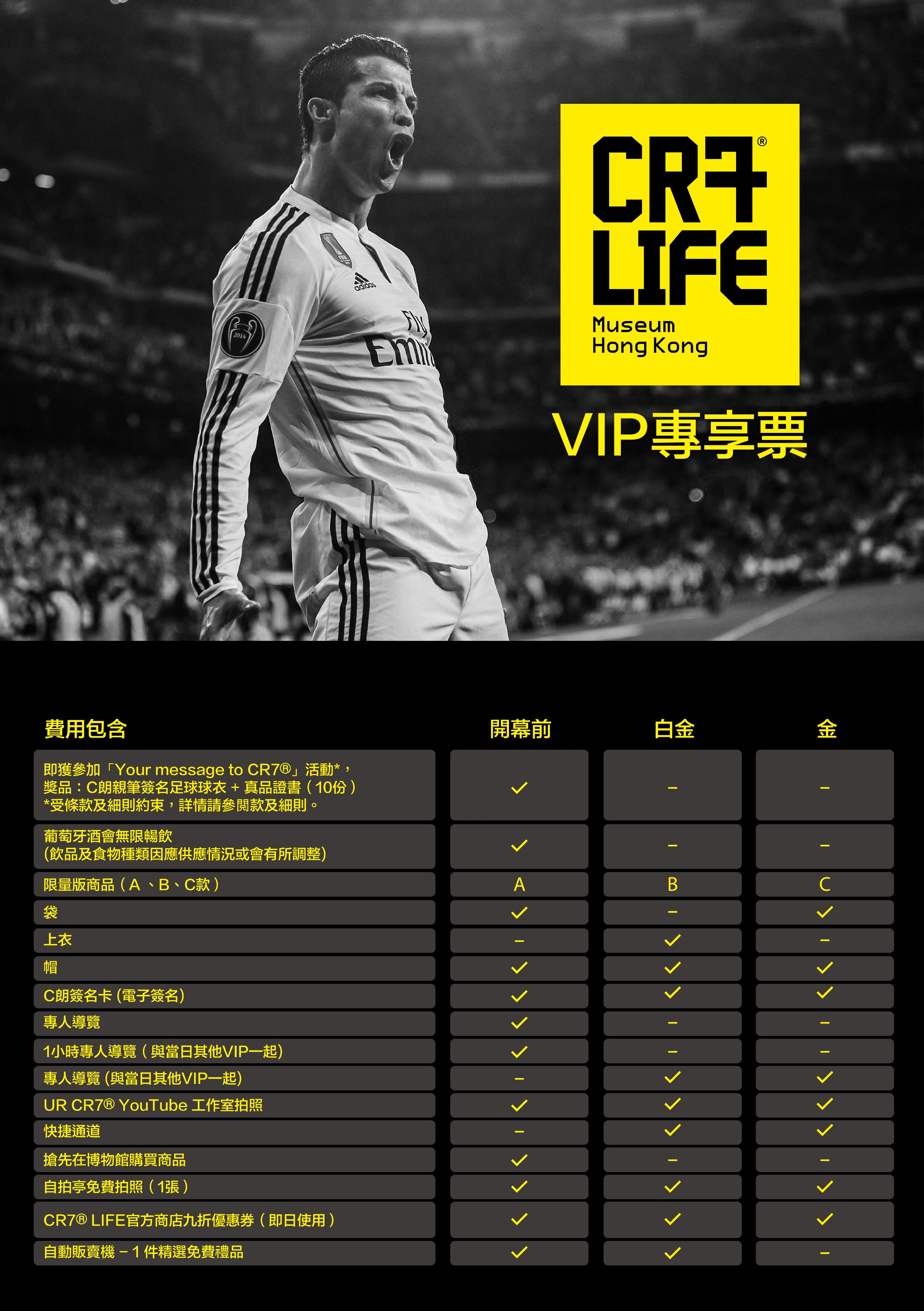 “CR7?生活博物館”門(mén)票今日(5日)正式開(kāi)售,最貴的VIP門(mén)票售價(jià)4000港幣(折合人民幣3687.88元),可在博物館開(kāi)幕前一至兩日進(jìn)場(chǎng)參觀(guān),及參加抽獎,贏(yíng)取C羅簽名T恤;成人票價(jià)180港幣,老人及兒童150港幣。