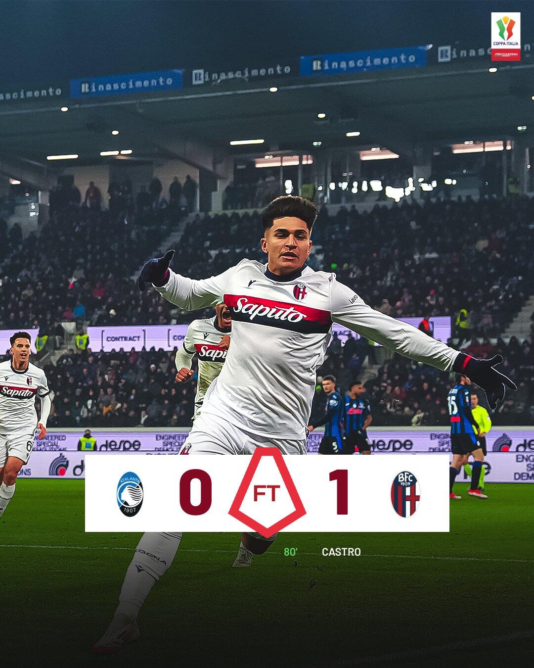 意大利杯1/4決賽,博洛尼亞1-0擊敗亞特蘭大晉級四強。上半場(chǎng),雙方均無(wú)建樹(shù);下半場(chǎng),直到第80分鐘,替補登場(chǎng)的卡斯特羅一擊制勝。