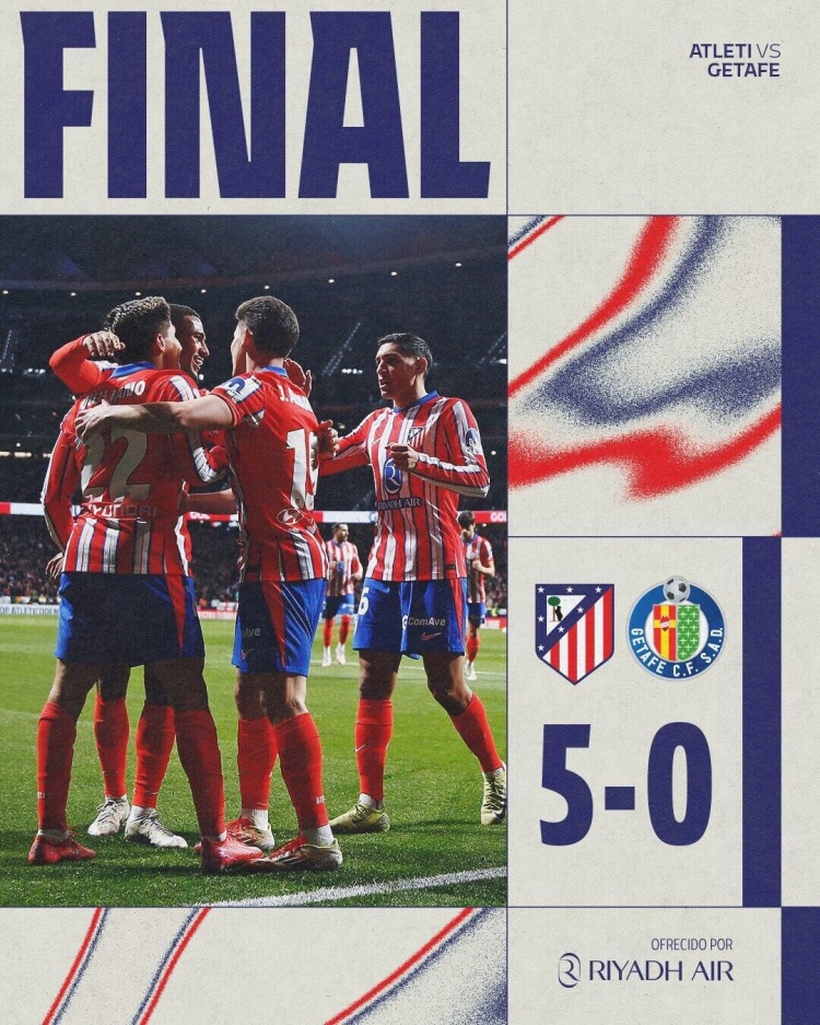 西班牙國王杯八強戰,馬競5-0赫塔菲晉級四強。上半場(chǎng),小西蒙尼雙響,阿爾瓦雷斯助攻利諾破門(mén)+失單刀;下半場(chǎng),小西蒙尼破門(mén)無(wú)效,科雷亞傳射建功,索爾洛特推射破門(mén)。