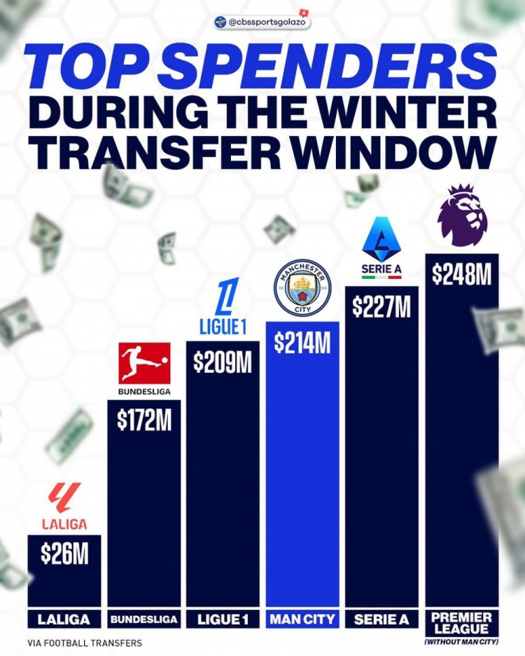 破費2.18億歐元簽入5名球員,超過(guò)西甲、德甲和法甲整個(gè)聯(lián)賽的花費,僅支付的溢價(jià)便超過(guò)1億歐元,過(guò)去的這個(gè)冬窗是屬于曼城的獨角戲,瓜迪奧拉已經(jīng)做好了圍繞哈蘭德進(jìn)行全面重建的準備。