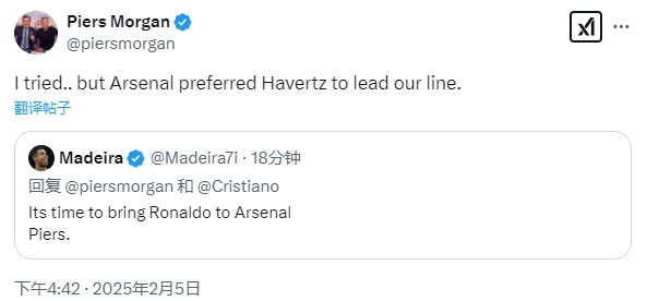 02月05日訊 名嘴摩根發(fā)文祝C羅40歲生日快樂(lè ),配圖是他向C羅贈送阿森納7號球衣。