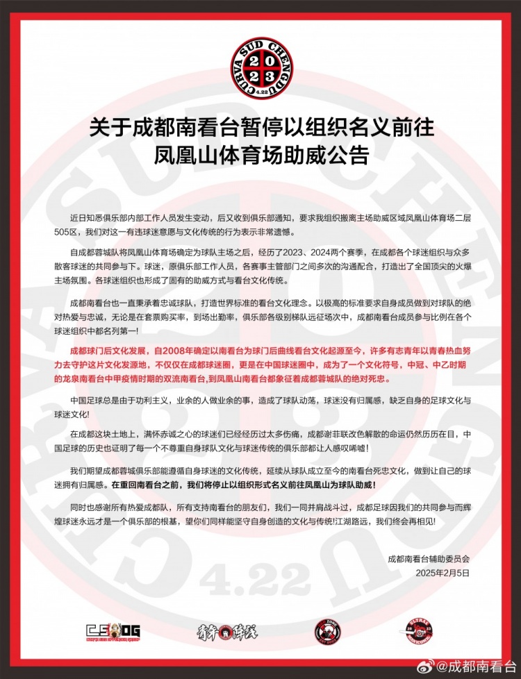 我們期望成都蓉城俱樂(lè )部能遵循自身球迷的文化傳統,延續從球隊成立至今的南看臺死忠文化,做到讓自己的球迷擁有歸屬感。在重回南看臺之前,我們將停止以組織形式名義前往鳳凰山為球隊助威!