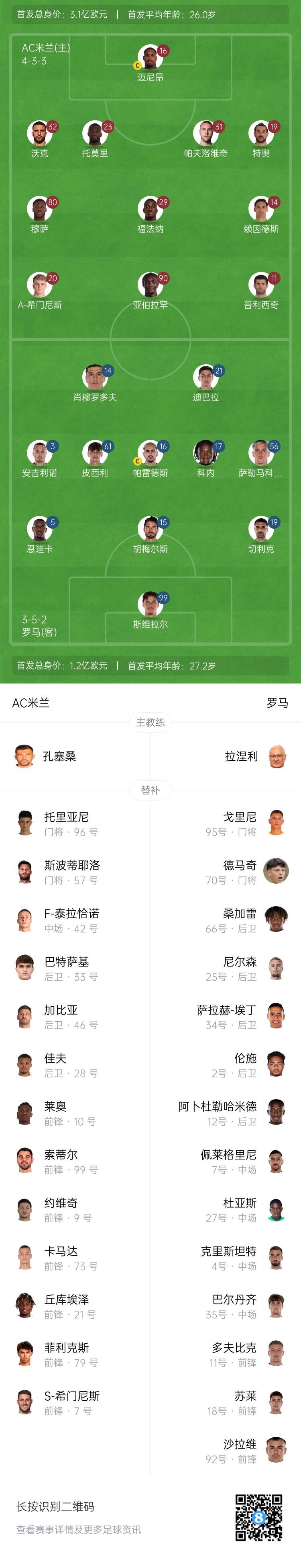 AC米蘭首發(fā):16-邁尼昂、32-沃克、23-托莫里、31-帕夫洛維奇、19-特奧、80-穆薩、29-福法納、14-賴(lài)因德斯、20-A-希門(mén)尼斯、90-亞伯拉罕、11-普利西奇