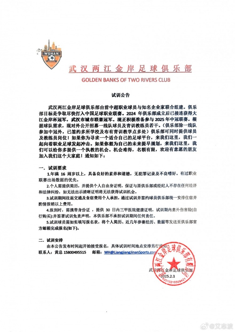2月6日訊 近日,武漢兩江金岸足球俱樂(lè )部官方發(fā)布試訓公告。
