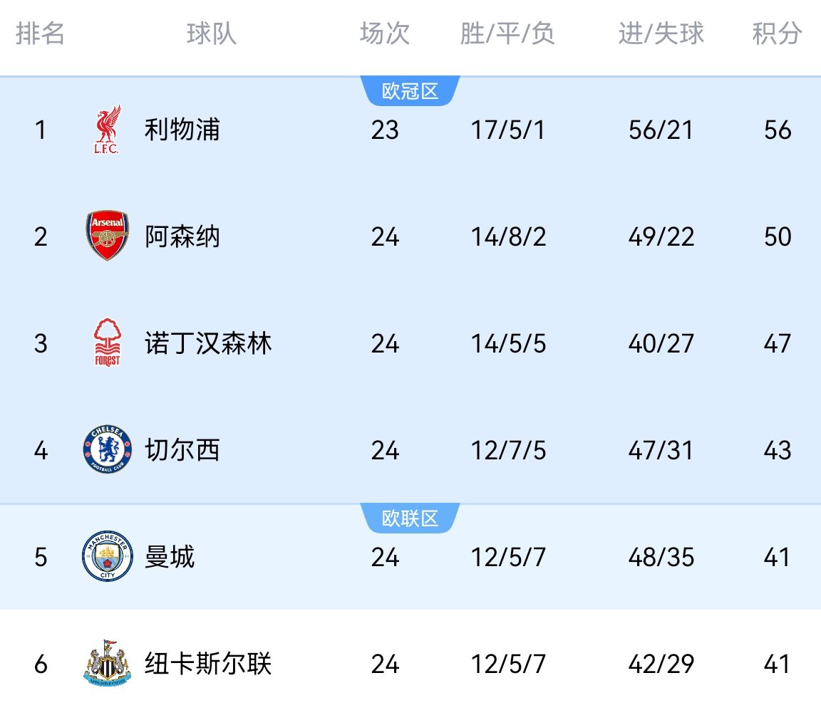 英超,24輪過(guò)后落后少賽一場(chǎng)的利物浦6分排名第二