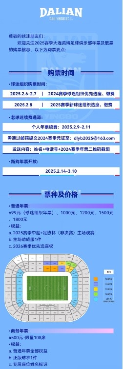 2月6日訊 大連英博俱樂(lè )部發(fā)布2025賽季票務(wù)公告,開(kāi)啟新賽季票務(wù)出售。