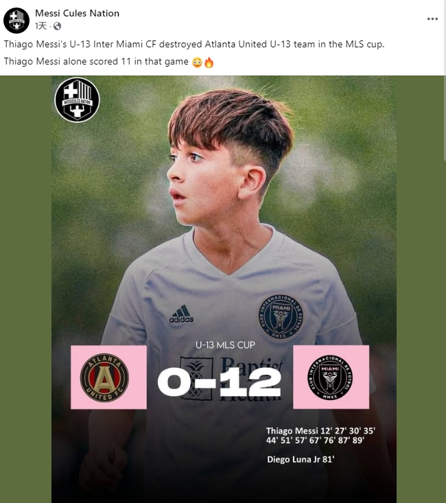這篇新聞來(lái)自球迷號Messi Cules Nation的杜撰,圖中顯示的U13 MLS CUP賽事近期并沒(méi)有進(jìn)行,24-25賽季美職聯(lián)青少年季后賽時(shí)間并不是在本月。官網(wǎng)的信息中,邁阿密U13隊伍最近的比賽也沒(méi)有對陣亞特蘭大聯(lián)。