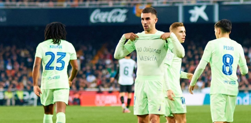 巴薩前鋒費蘭今日對陣老東家瓦倫西亞戴帽,他進(jìn)球后沒(méi)有慶祝,并掀開(kāi)球衣表示對瓦倫災民的紀念:“別忘記瓦倫洪水受害者”。