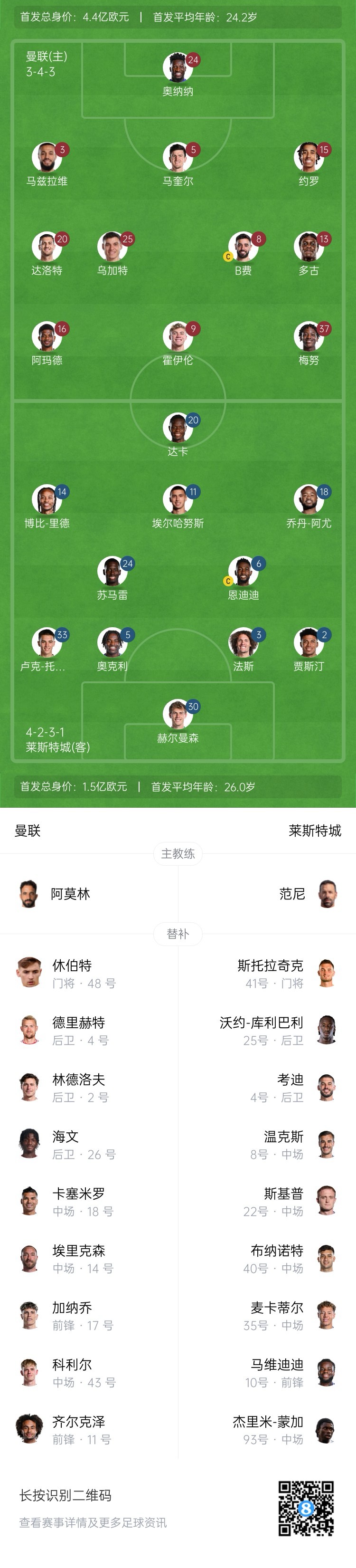 曼聯(lián)vs萊斯特城首發(fā):霍伊倫、阿瑪德先發(fā),B費出戰多古首秀