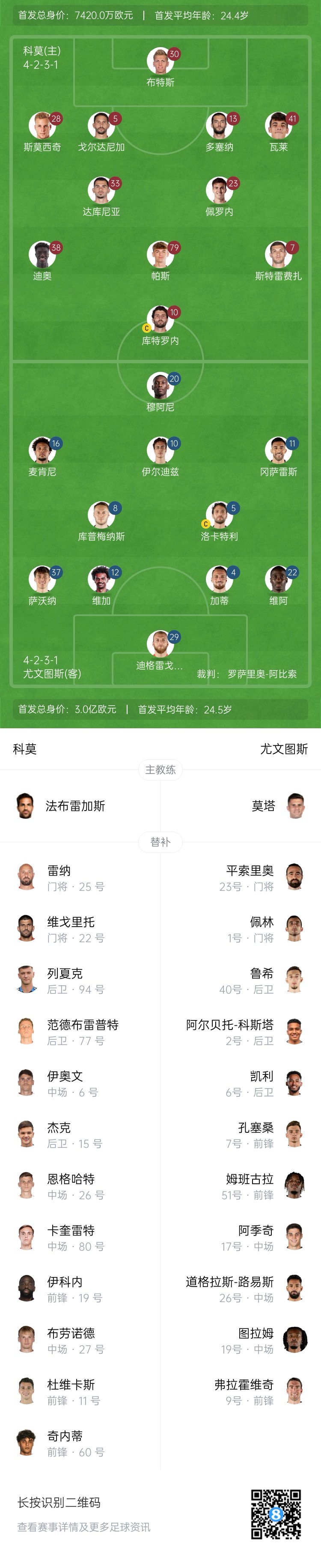 科莫替補:25-雷納、22-維戈里托、94-斯文-列夏克、77-范德布雷普特、6-伊奧文、15-費利佩-杰克、26-恩格哈特、80-卡奎雷特、19-伊科內、27-布勞諾德、11-杜維卡斯、60-費德里科-基內蒂