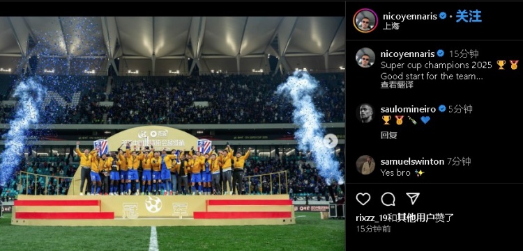 李可社媒慶祝申花奪冠:超級杯奪冠,這是球隊的完美開(kāi)局