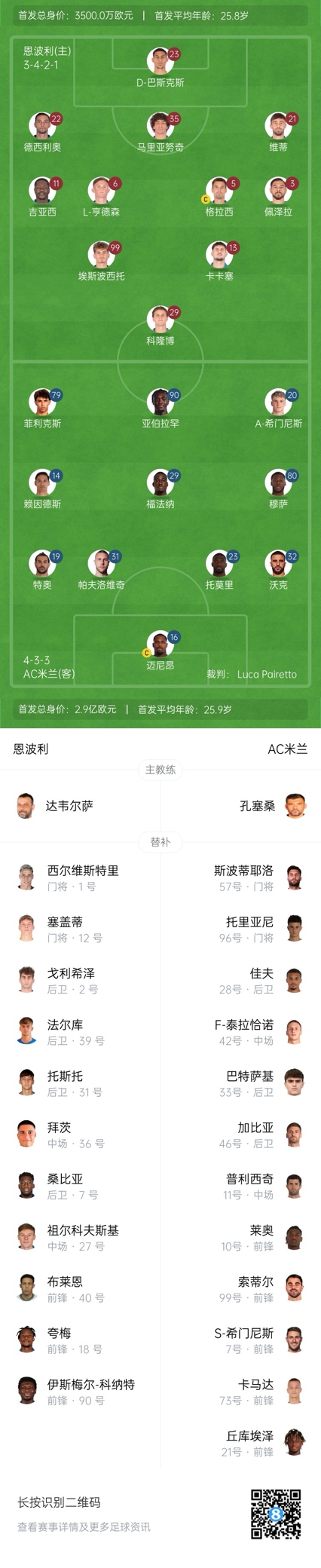 2月9日訊 意甲第24輪 恩波利主場(chǎng)迎戰AC米蘭,賽前首發(fā)名單公布。