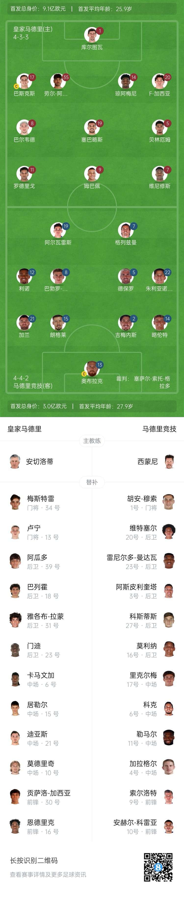 皇馬首發(fā):1-庫爾圖瓦、17-巴斯克斯、14-瓊阿梅尼、20-弗蘭-加西亞、35-勞爾-阿森西奧、19-塞巴略斯、8-巴爾韋德、5-貝林厄姆、11-羅德里戈、9-姆巴佩、7-維尼修斯