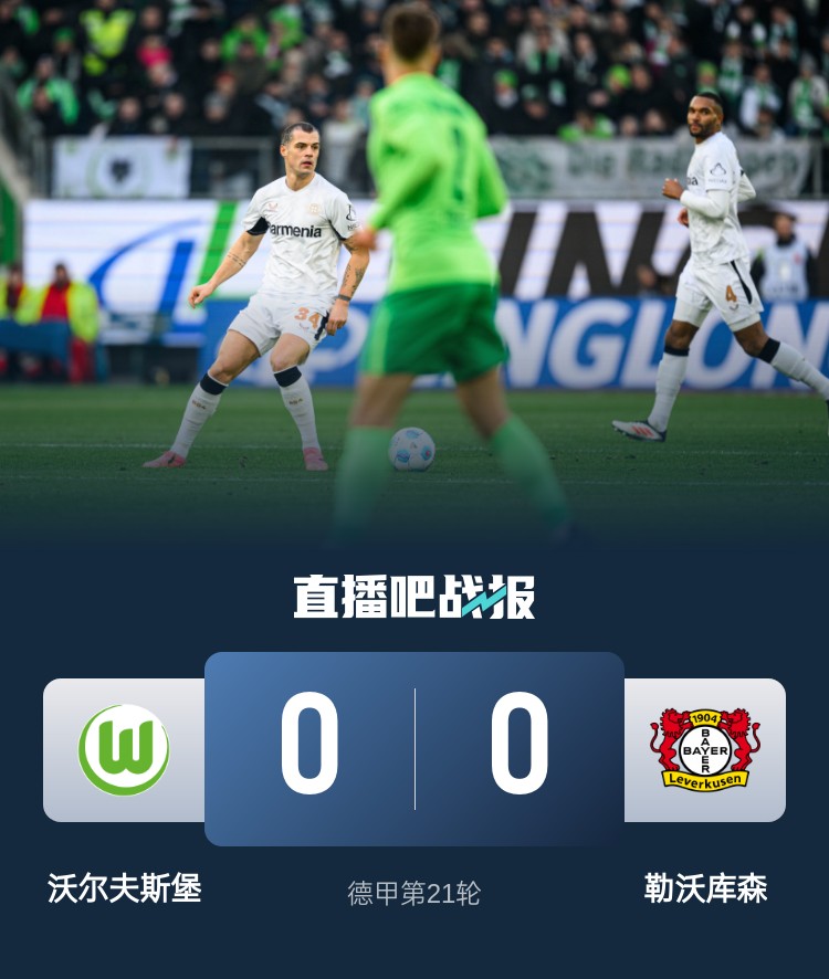 勒沃庫森本輪0-0戰平沃爾夫斯堡,目前球隊落后榜首8分。