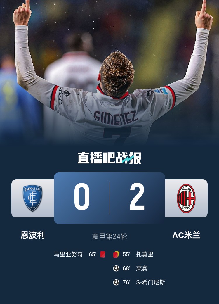 米蘭本輪2-0擊敗恩波利,雙方在下半場(chǎng)都被罰下一人,最終米蘭憑借萊奧和新援S-希門(mén)尼斯的進(jìn)球拿下勝利。