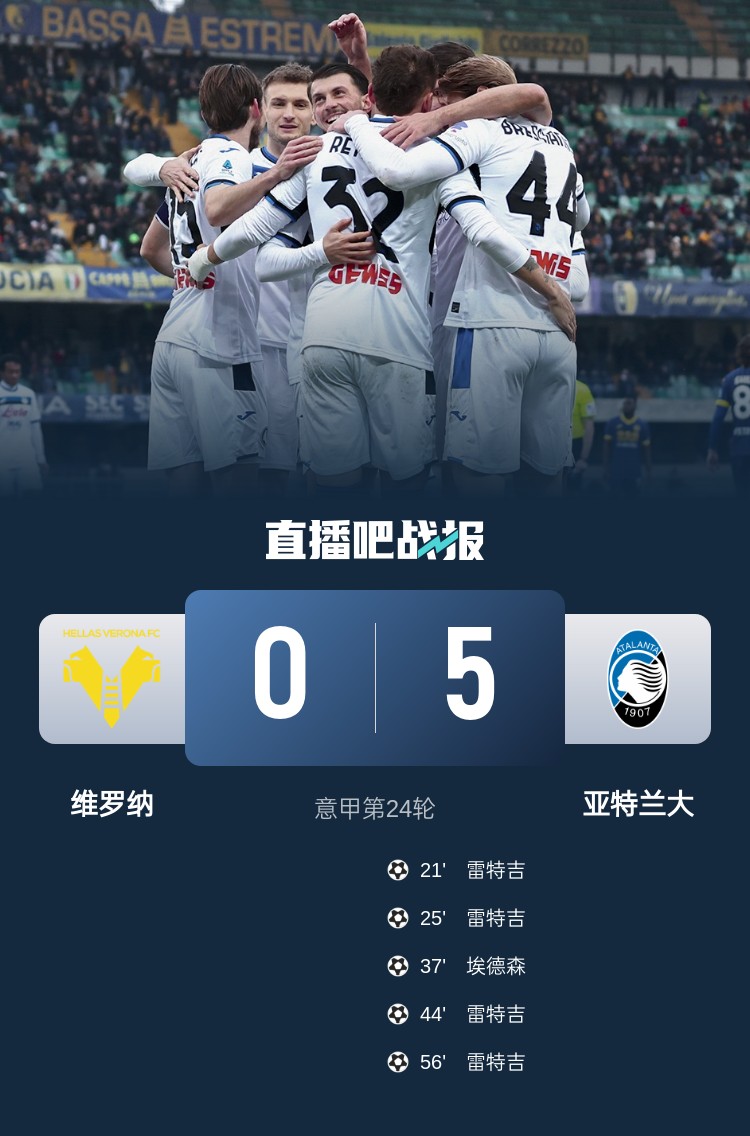 亞特蘭大本輪5-0橫掃維羅納,雷特吉大四喜成為本場(chǎng)絕對明星。