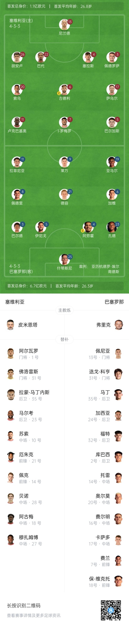 塞維利亞首發(fā):3-佩德羅薩、13-尼蘭德、4-塞拉斯、22-巴代、26-胡安盧-桑切斯、6-古德利、17-薩烏爾、20-索烏、5-巴爾加斯、7-伊薩克-羅梅羅、11-盧克巴基奧