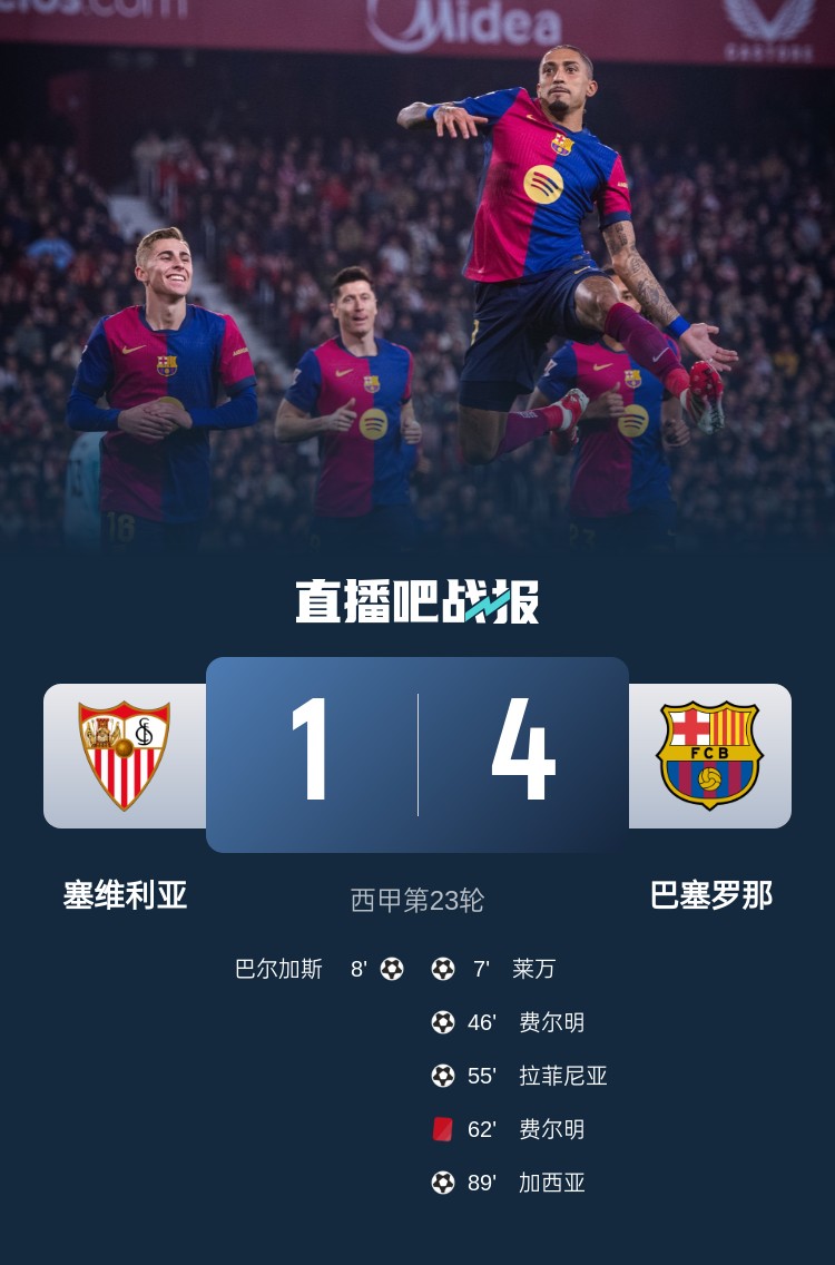 西甲第23輪,巴薩4-1塞維,距離榜首僅差2分。上半場(chǎng),萊萬(wàn)墊射破門(mén),巴爾加斯1分鐘后迅速扳平,阿勞霍被鏟傷退;下半場(chǎng),費爾明頭球,拉菲尼亞再下一城,費爾明紅牌,補時(shí)前埃里克-加西亞再進(jìn)一球。