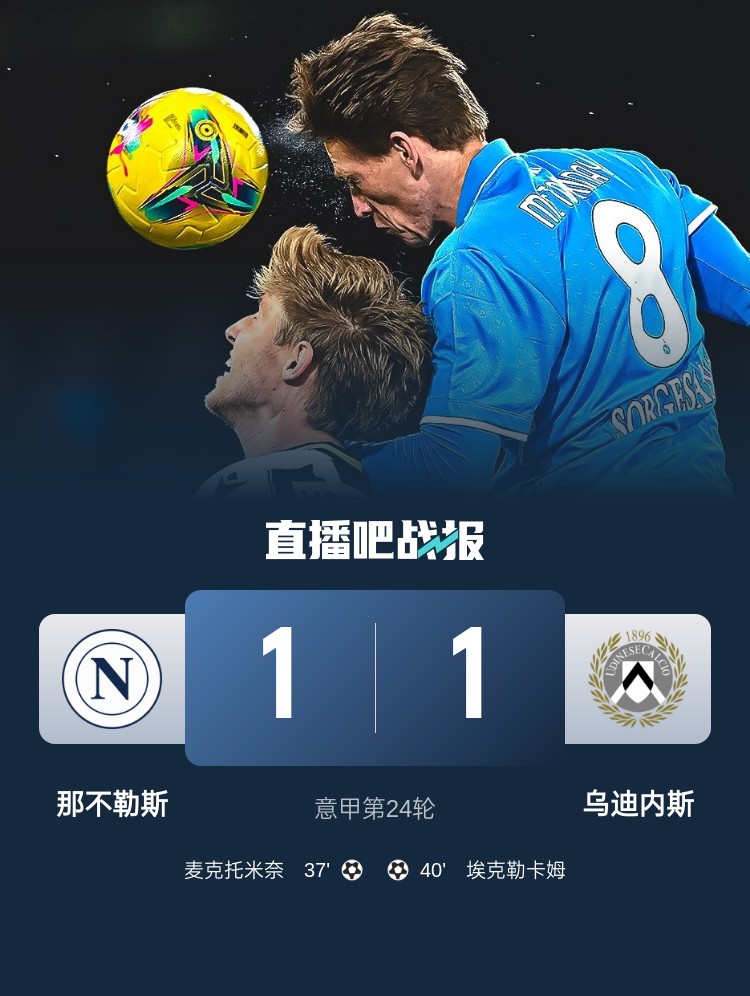 意甲第24輪,那不勒斯1-1戰平烏迪內斯。上半場(chǎng),麥克托米奈率先打破僵局;??死湛钒馄奖确?。下半場(chǎng),雙方均無(wú)建樹(shù)。
