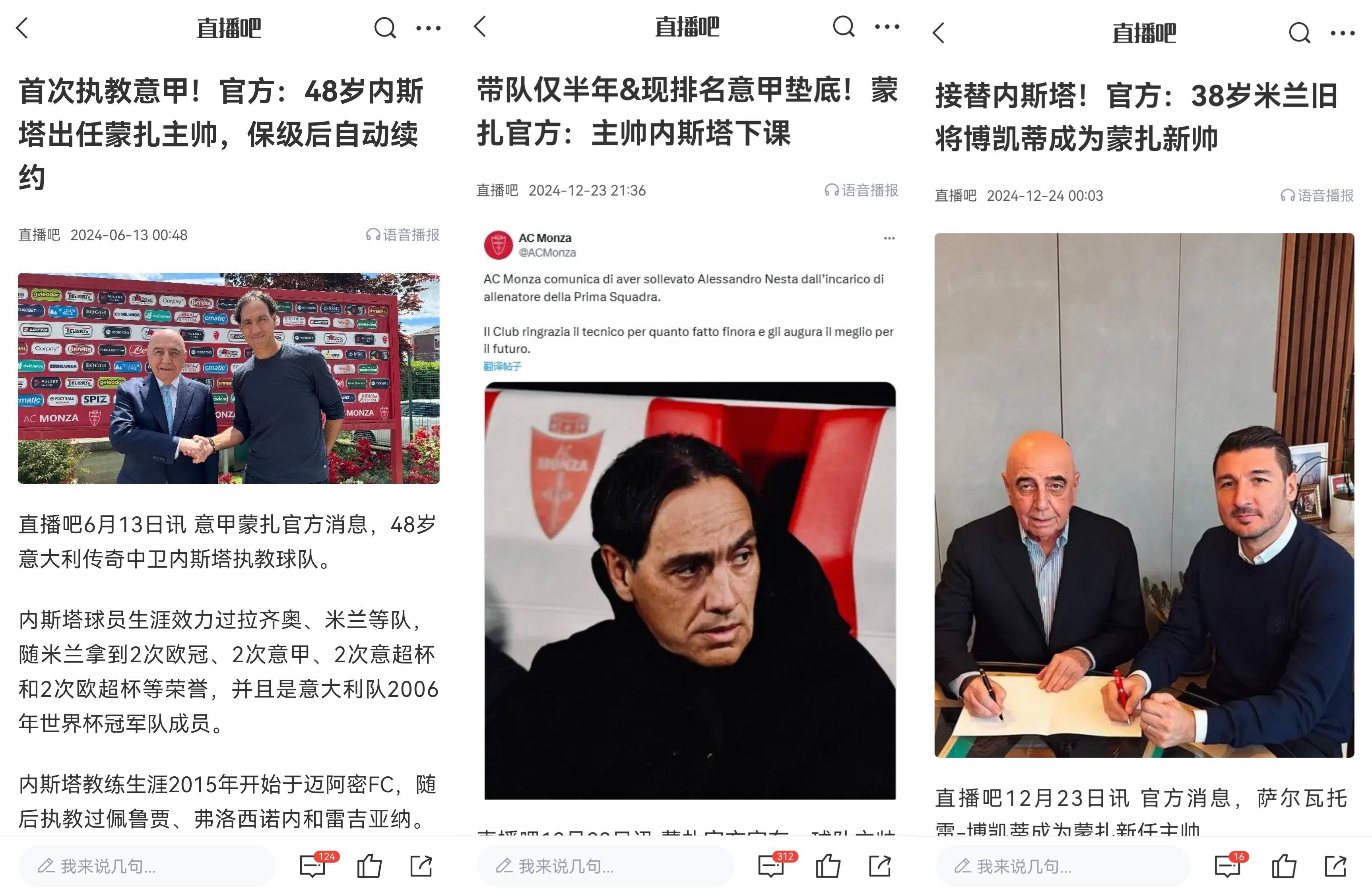 02月10日訊 意甲蒙扎官方宣布,解雇現主帥博凱蒂,再次任命48歲的內斯塔執教球隊。