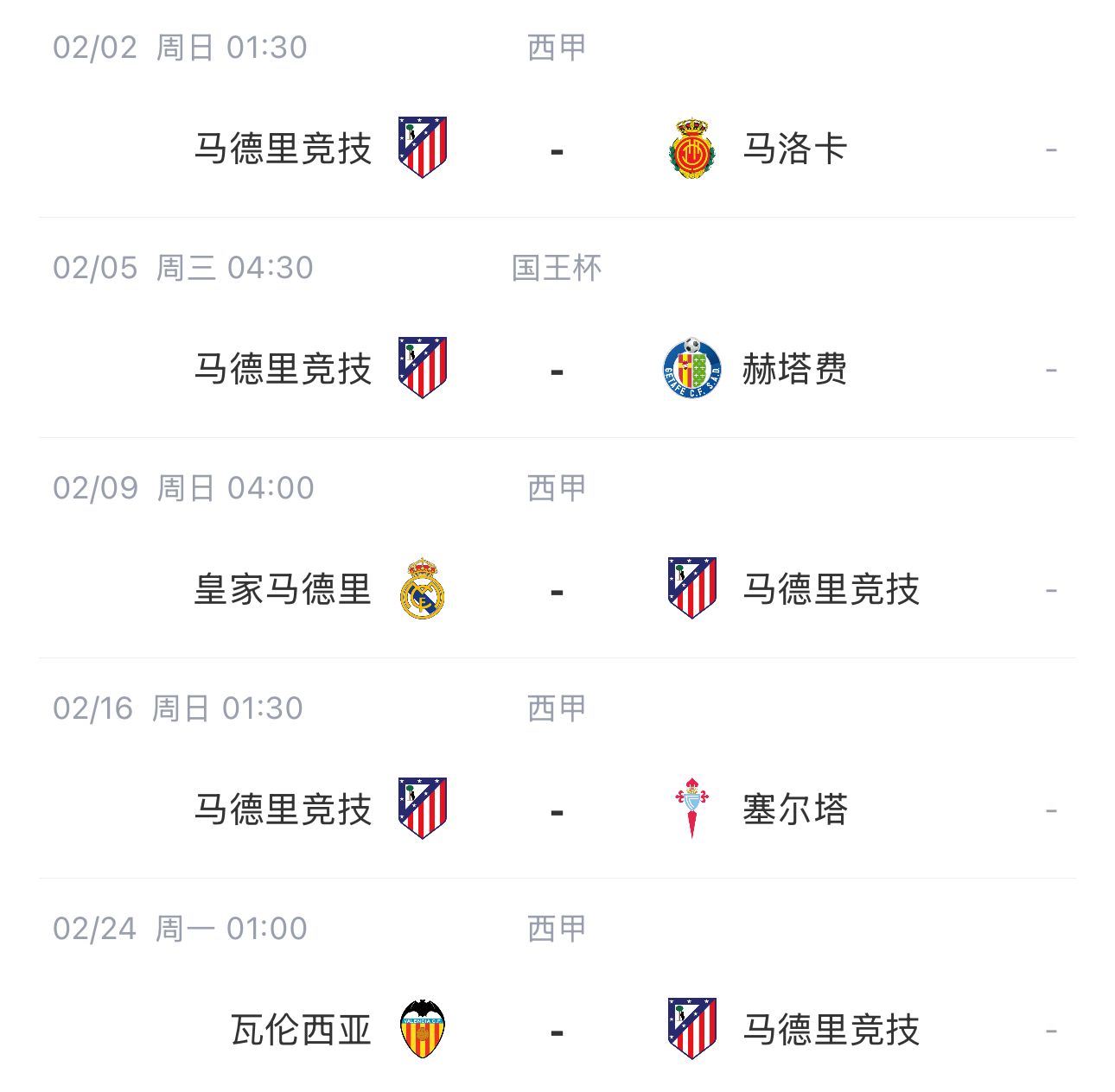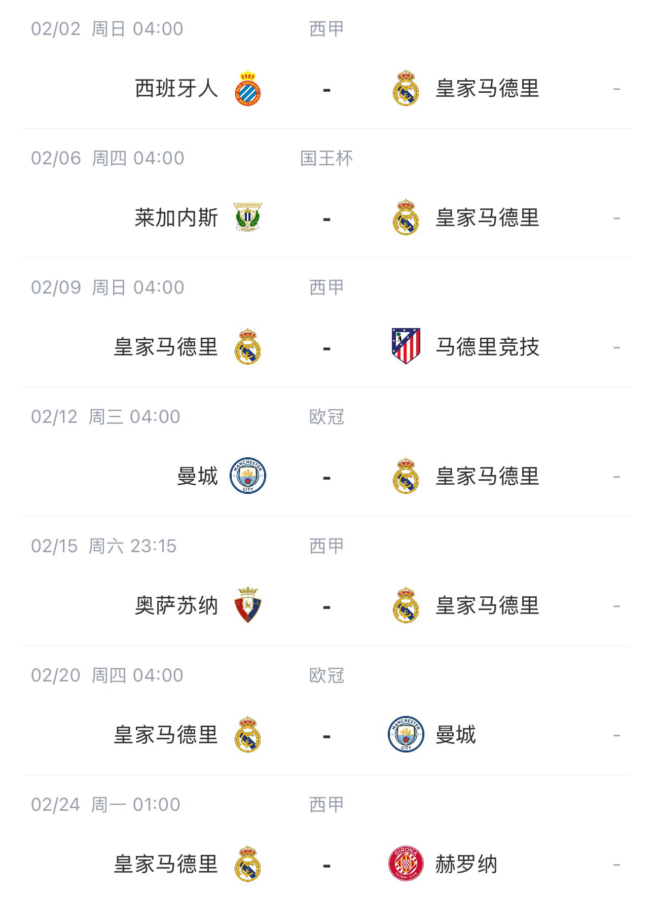 皇馬2月面臨賽程考驗,由于巴薩和馬競直通歐冠16強,皇馬比這兩位西甲爭冠對手多出兩場(chǎng)歐冠淘汰賽附加賽,而且附加賽對手還是曼城。