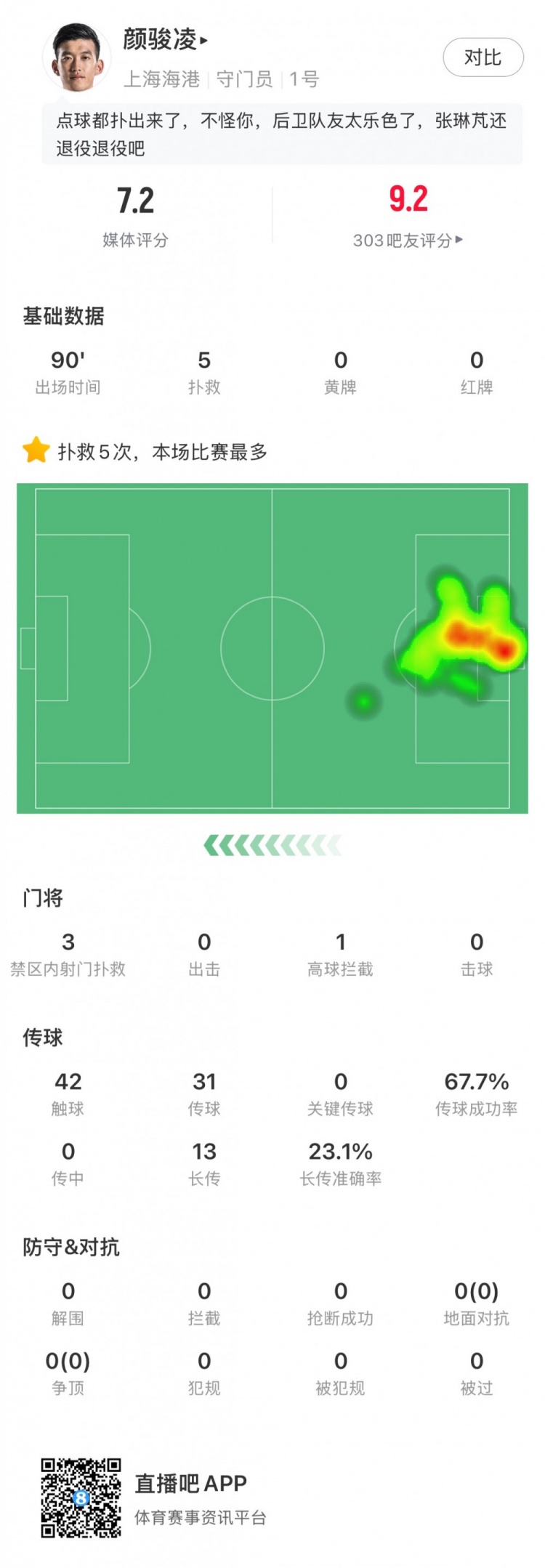 撲救5次,其中禁區內射門(mén)撲救3次,高球攔截1次
