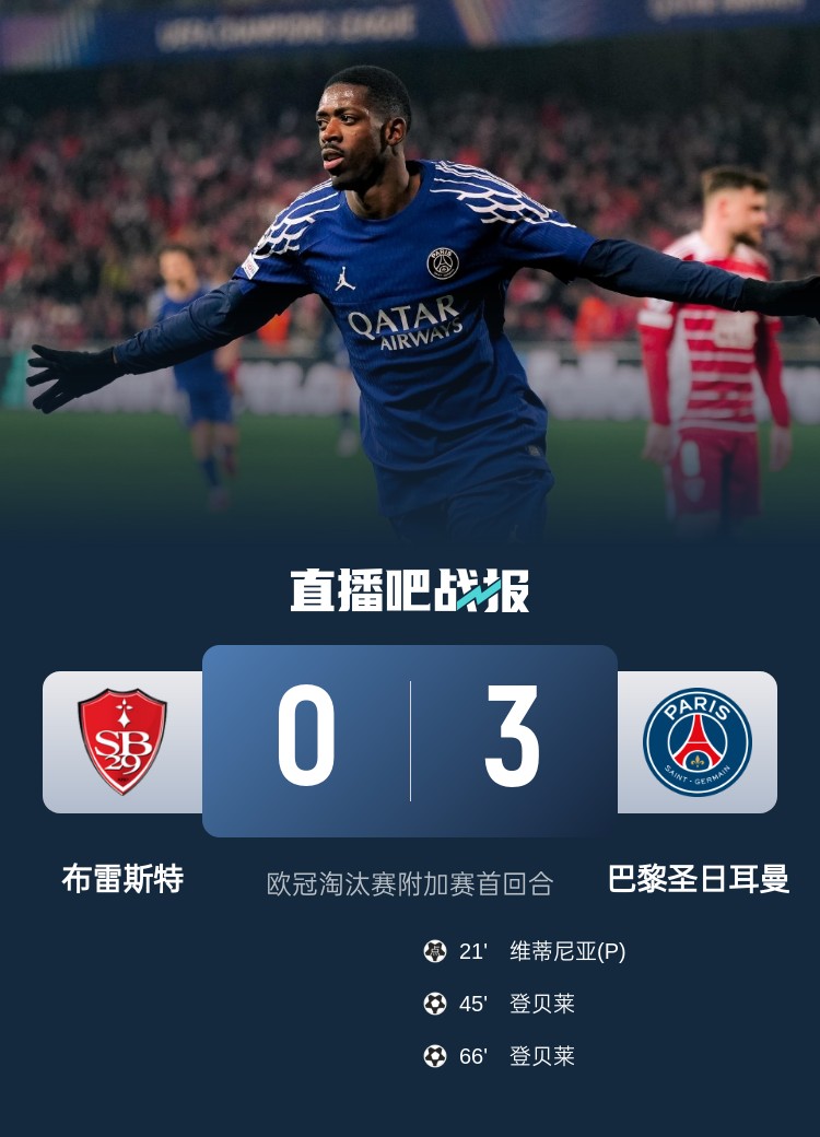登貝萊梅開(kāi)二度+造點(diǎn),巴黎3-0布雷斯特取得先機。