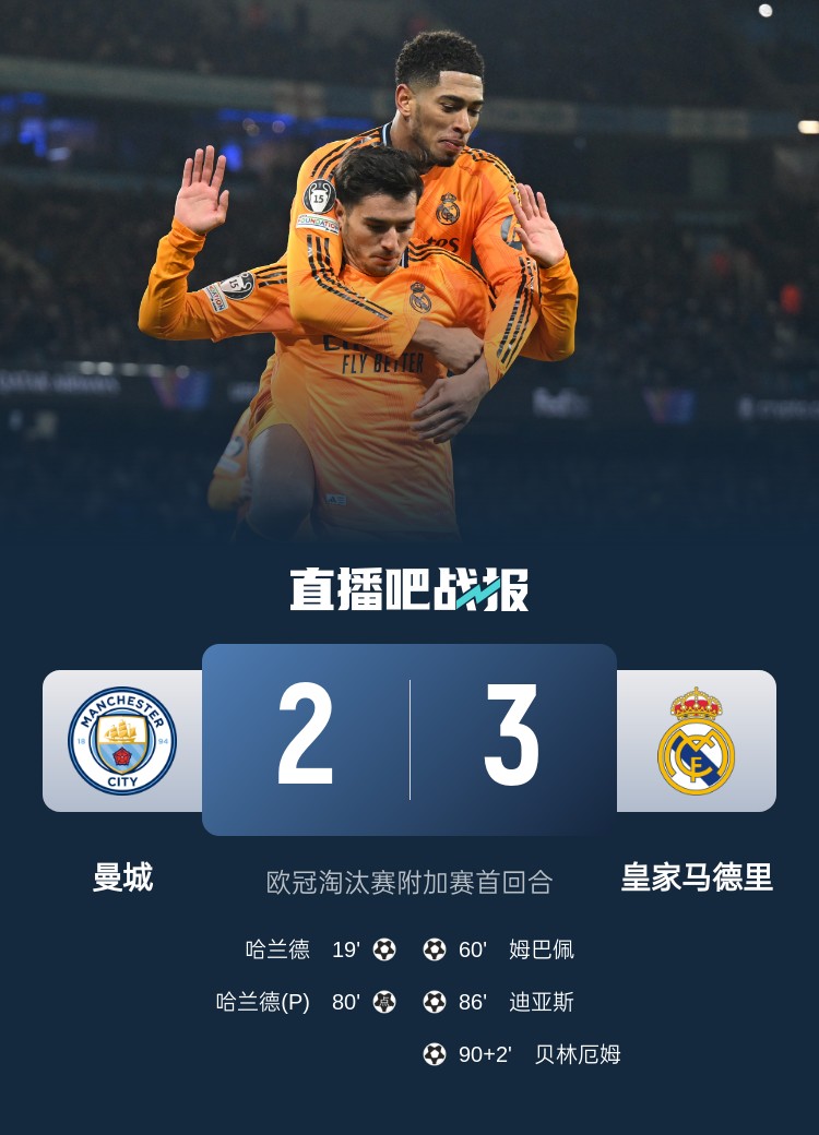 哈蘭德雙響,貝林厄姆絕殺,皇馬3-2曼城,占據先機。