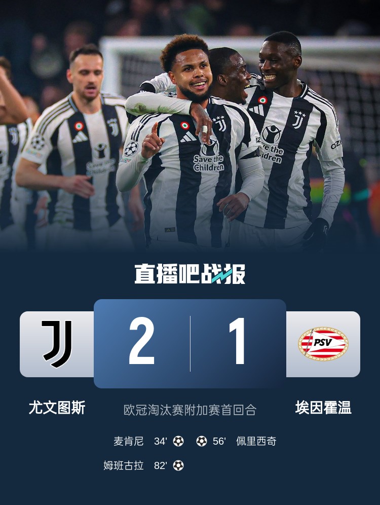 姆班古拉替補制勝,尤文2-1埃因霍溫,雙方次回合將于2月20日移師埃因霍溫主場(chǎng)菲利普球場(chǎng)進(jìn)行。