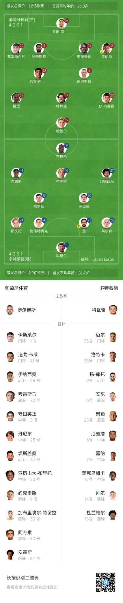 葡體替補:1-伊斯雷爾、41-卡萊、5-守田英正、9-約克雷斯、23-布拉干薩、25-伊納西奧、30-加布里埃爾-特謝拉、47-埃斯蓋奧、50-布里托、72-愛(ài)德華多-夸雷斯馬、67-安霍斯、90-阿方索-莫雷拉