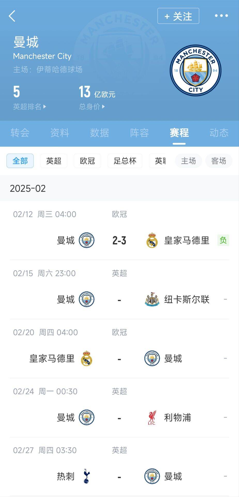 02月12日訊 曼城在歐冠附加賽的首回合2-3不敵皇馬,藍月亮的魔鬼賽程首戰告負。接下來(lái),曼城將要面對的是:紐卡、皇馬、利物浦、熱刺…… 標簽: 足球 英超 曼城 西甲 皇家馬德里 利物浦 紐卡斯爾聯(lián) 熱刺