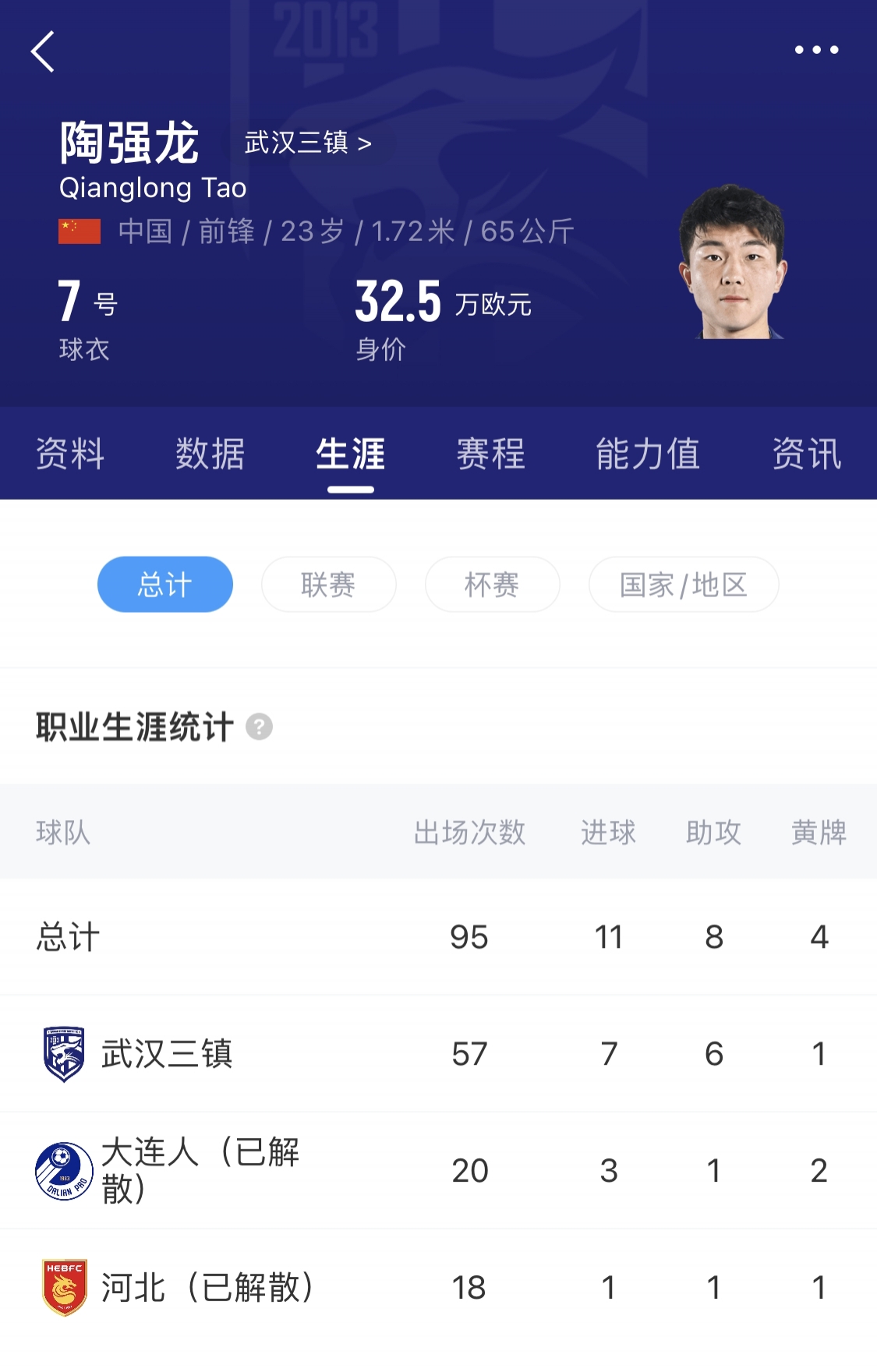 陶強龍于2001年11月20日出生在安徽,在場(chǎng)上司職前鋒。