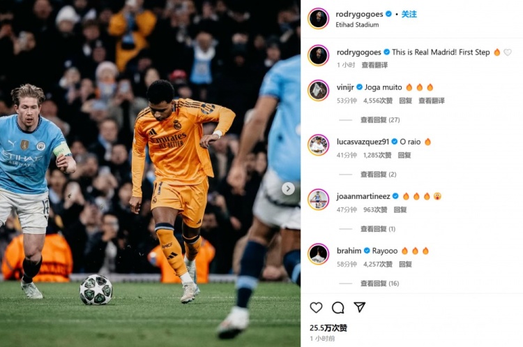 本場(chǎng)客串右后衛的巴爾韋德表示:“這就是真正的皇馬!”而右邊鋒羅德里戈也配文道:“這就是皇馬!邁出(晉級)第一步????????
