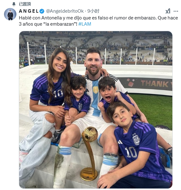 阿根廷媒體LAM記者Angel debrito在社媒辟謠寫(xiě)道:我與安東內拉進(jìn)行了交談,她告訴我懷孕傳聞是假的,他們已經(jīng)說(shuō)了她懷孕的事3年了。