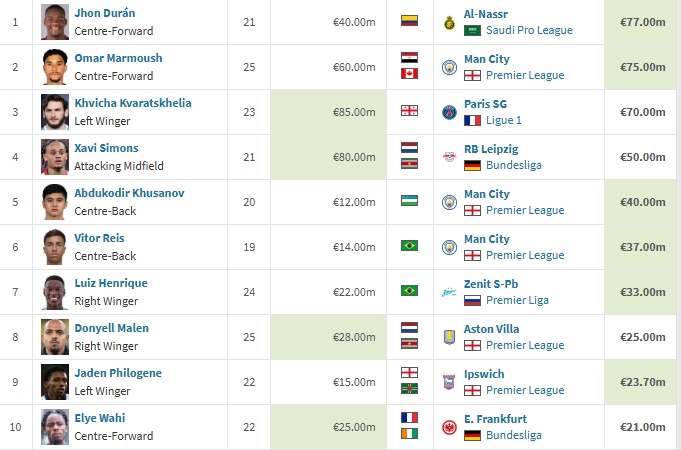利雅得勝利官宣簽下杜蘭,杜蘭也以7700萬(wàn)歐暫時(shí)成為今年冬窗標王,前十曼城有3人入選。