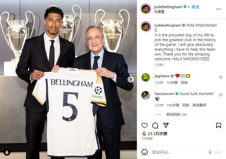 2023年夏天,貝林厄姆加盟皇馬,穿上了偶像齊達內在皇馬穿過(guò)的五號球衣。那一天,接受采訪(fǎng)的貝林厄姆非常激動(dòng)地說(shuō),齊達內是他的偶像,能夠在皇馬和偶像穿同樣號碼的球衣,他非常感動(dòng),希望自己能夠成為皇馬新五號。