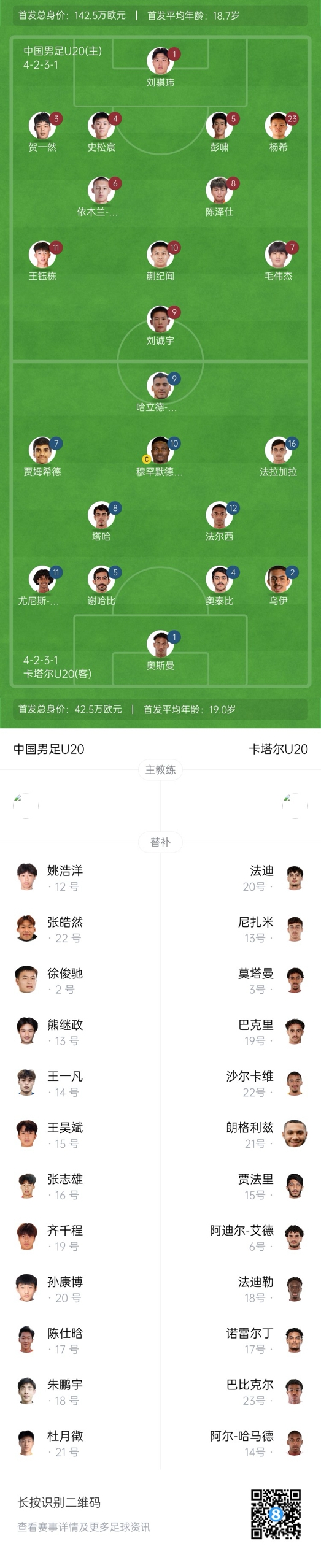 卡塔爾U20首發(fā):1-阿布貝克爾-奧斯曼、2-阿尤布-烏伊、4-奧泰比、5-謝哈比、11-尤尼斯-巴拉、12-法爾西、8-塔哈、10-易卜拉欣-穆罕默德-阿里、7-賈姆希德、9-古達、16-法拉加拉