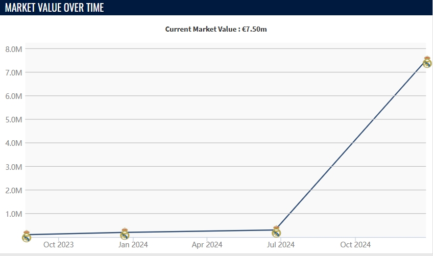勞爾-阿森西奧本賽季才進(jìn)入皇馬一線(xiàn)隊,至今代表球隊出場(chǎng)21次,在西甲送出過(guò)一記助攻。值得一提的是,這位小將在連續兩場(chǎng)硬仗中都首發(fā)出場(chǎng),球隊1-1戰平馬競、3-2戰勝曼城。目前球員德轉身價(jià)僅為750萬(wàn)歐元。