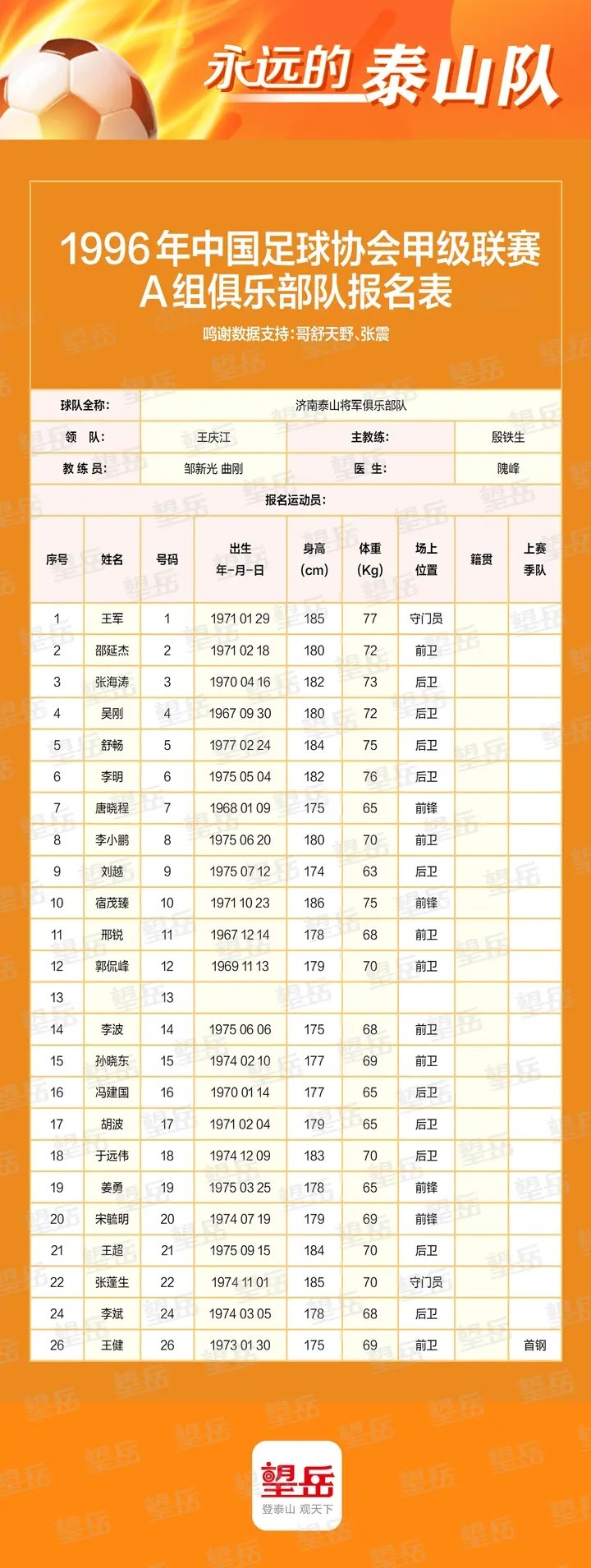 泰山隊1996年名單和成績(jì)如下: ???