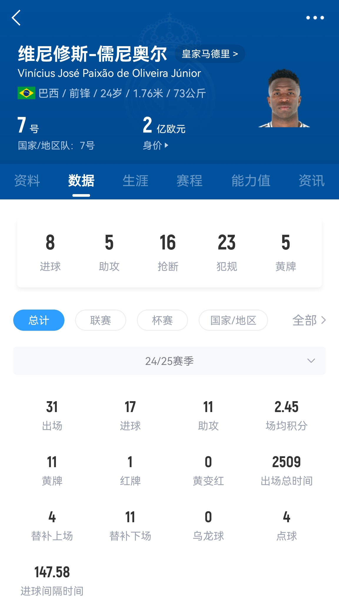 維尼修斯賽季數據
