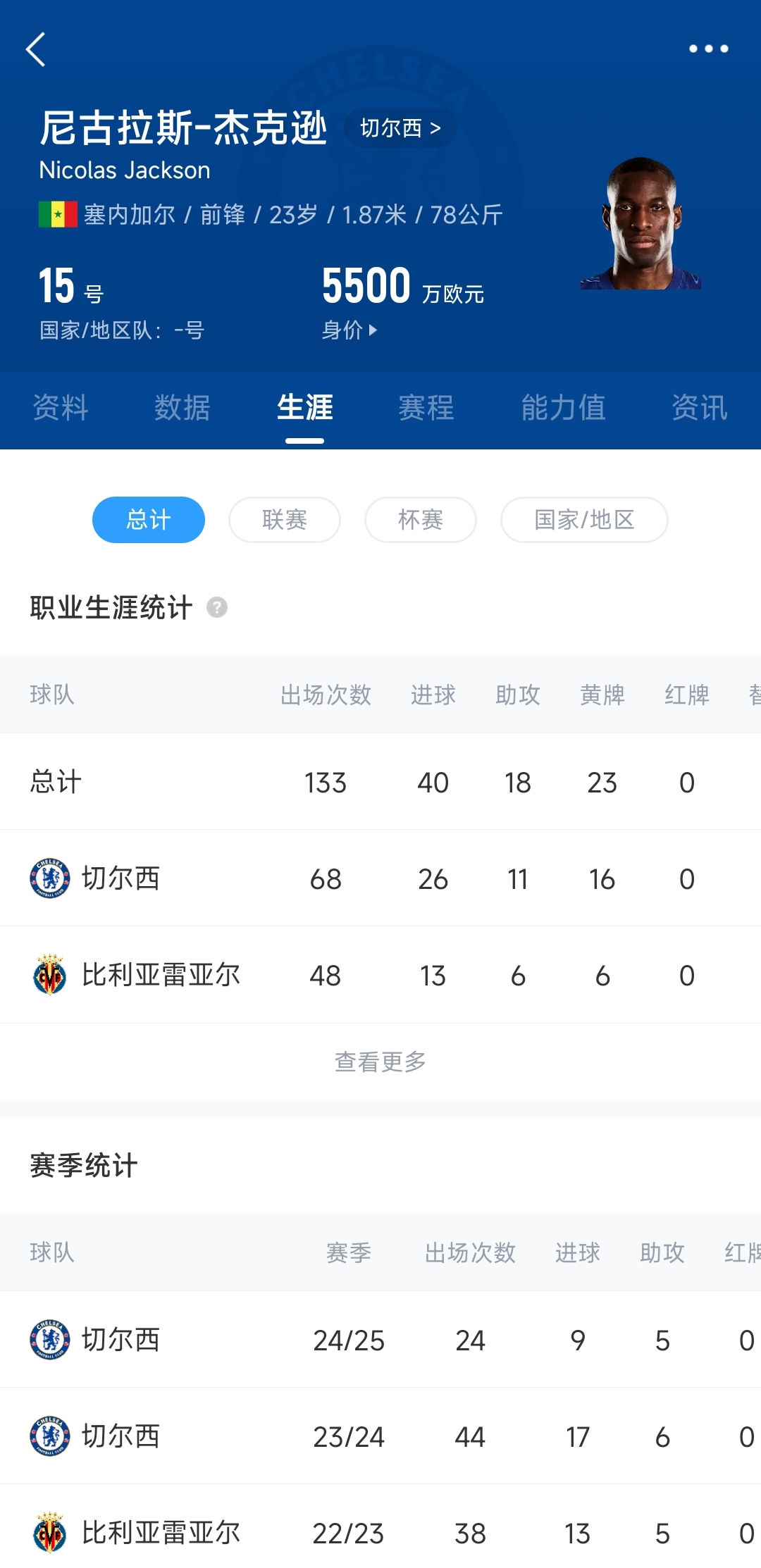 23歲的塞內加爾前鋒杰克遜,本賽季代表切爾西出戰24場(chǎng)比賽,貢獻9球5助。目前切爾西英超24輪積43分,排名聯(lián)賽積分榜第4,落后第三名諾丁漢森林4分。