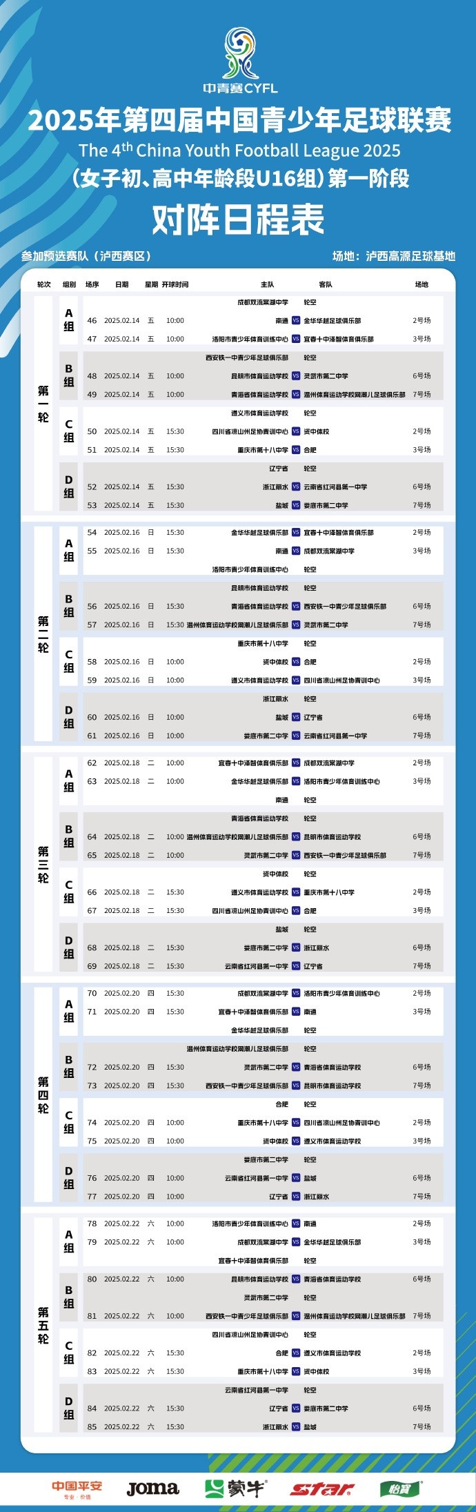 2025年第四屆中國青少年足球聯(lián)賽(女子初、高中年齡段U16組)第一階段競賽日程公布