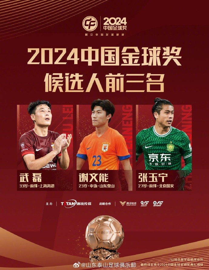 同時(shí),山東泰山隊的謝文能也入選2024中國金球獎候選人前三名。期望王大雷和謝文能在俱樂(lè )部和國家隊的比賽中繼續發(fā)揚頑強拼搏、永不放棄的泰山足球精神,用他們的實(shí)力和激情為中國足球貢獻力量。