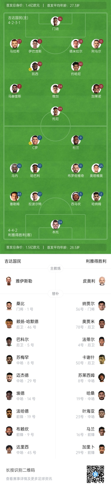 吉達國民首發(fā):16-愛(ài)德華-門(mén)迪、27-馬加希斯、3-伊巴涅斯、28-德米拉爾、15-阿馬爾、79-凱西、30-約哈尼、7-馬赫雷斯、24-加布里-維加、13-加萊諾、99-伊萬(wàn)-托尼