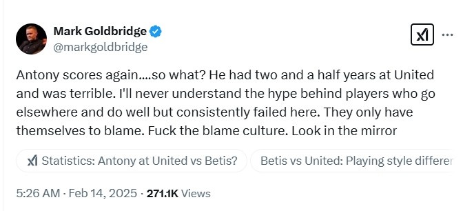 英國著(zhù)名曼聯(lián)球迷頻道The United Stand的主理人Mark Goldbridge對此表示道:“安東尼又進(jìn)球了...那又怎么樣?他在曼聯(lián)待了2年半時(shí)間,表現很糟糕。我永遠無(wú)法理解那些去其他地方表現很好的球員背后的炒作,不過(guò)他們總是在這里失敗。他們只能怪自己,去他*的責備文化,照照鏡子吧?!?/p>